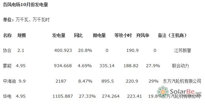中海油9.9万千瓦风电场10月份发电量为2187万千瓦时,限发电量895.5万千瓦时。华电风光互补4.95万千瓦风电场10月份发电量为1105.887万千瓦时,限发电量274.264万千瓦时。