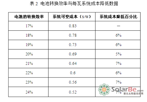 单晶的转换效率高于多晶,这不仅表现在普通工艺单晶电池的转化效率高于多晶电池至少约1%,更表现在相同的PERC工艺条件下,相比各自的普通工艺电池,单晶电池转化效率会进一步提高约0.6%~1%,而多晶电池转化效率仅提高约0.5%。显然,单晶转换效率的提高更具优势和潜力,这同样来自于单多晶的材料特性差异。未来随着PERC等高效电池技术的量产应用,单多晶电池转化效率差距将越来越大。而根据测算,电池转换效率每提高1个百分点,每瓦系统成本降低5-7个百分点(见表2)。所以做高功率电池组件,单晶的成本永远比多晶低。目前,单多晶在电池端成本已打平。