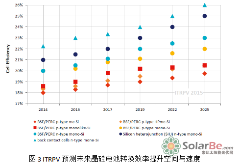 ITRPV也同样做出权威预测,未来晶硅电池转换效率提升空间与速度较大的电池主要集中在背接触、HIT以及PERC单晶电池上,多晶以及类单晶的电池转换效率提升将遭遇瓶颈,提升空间有限。2025年,单晶电池最高转换效率有望比多晶电池效率绝对值高出6%,每瓦系统可变成本将下降30-40%左右。
