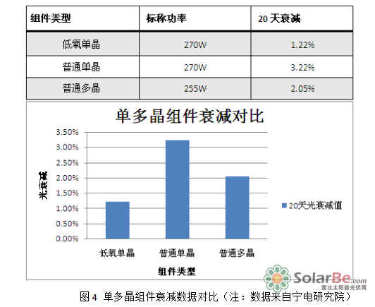 图4 单多晶组件衰减数据对比(注:数据来自宁电研究院)