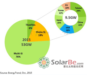 根据TrendForce旗下新能源事业处EnergyTrend公布的最新数据,截止2015年10月份,全球光伏中单晶硅片比例进一步攀升至18%,而多晶硅片比例占比进一步萎缩至76%。全球单晶硅片在晶体硅光伏中的占比高于国内。价格方面,目前单晶硅片价格已从2015年年初的US$1.04降至US$0.92~0.93/pc,单晶电池片成本也连带下降。近期中国市场已出现主流单晶电池价格达到RMB 2.35/W,为市场首次出现单晶电池价格等于多晶电池价格,使得单晶硅片在组件端更高的性价比优势进一步凸显,单晶技术的快速进步在确保利润的前提下,价格快速下降并逼近多晶价格,并仍然具备比多晶更大的降价空间,在蓄势抢占多晶市场份额的同时,加速了光伏发电去补贴实现平价上网的步伐。