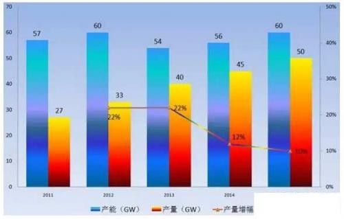 全球2011-2015太阳能光伏组件产能与产量(GW)