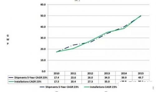 2010-2015全球太阳能光伏组件出货量(数据统计范围只限于第一手交易,买方包括安装商、EPC、开发方、终端用户、其他制造商、其他个体)