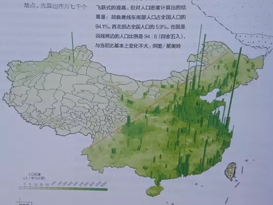 胡焕庸线,又称黑河-腾冲线,线东南方36%国土居住着96%人口(根据2000年第五次全国人口普查资料,按胡焕庸线东南半壁占全国国土面积43.8%、总人口94.1%)