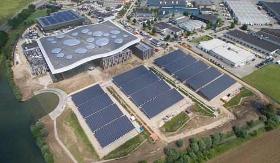 该项目位于荷兰东部城市阿纳姆(Arnhem),建在能源电力企业Liander的新总部大楼停车场顶棚上。项目大小1.5MW,一共使用了5000块Sunpower电池组件和70台Growatt20000UE三相商用组串式逆变器。整个停车棚的外表非常壮观,一次性可停放数百辆汽车,上面实现太阳能发电,下面为汽车遮风挡雨,还具有良好的吸热性,避免夏天汽车停放温度过高的问题。