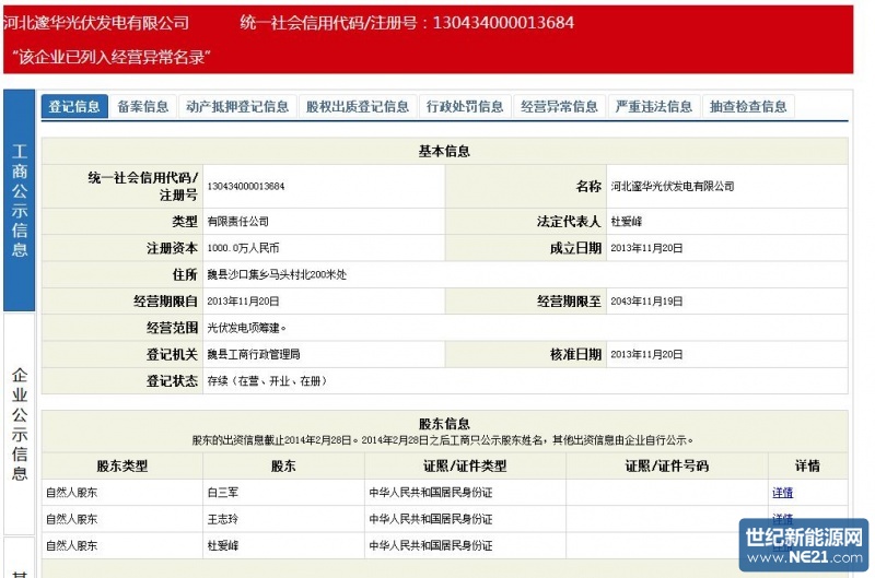 杜爱峰作为法人的河北邃华光伏发电有限公司注册资金1000万,拟定投资6.5亿建设光伏发电项目。据公司业务人员称由于没有资金,项目只是圈了地,至今未开工。