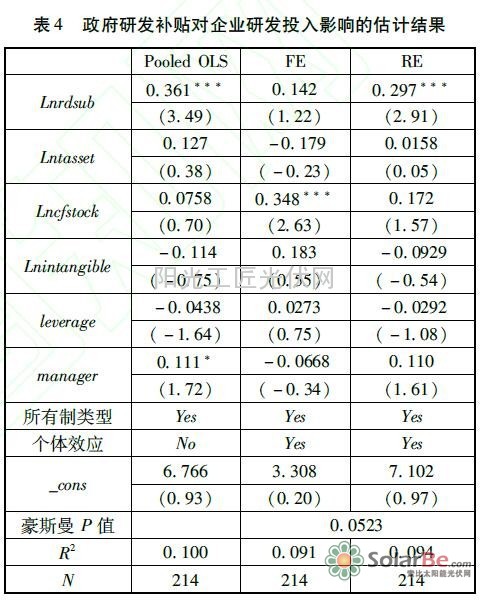 虽然政府公共投入有助于解决研发活动中的市场失灵,但事前并不清楚政府公共资助是否是促进私人企业研发支出的有效方法。从理论上讲,政府研发补贴政策有可能对企业研发行为产生替代效应和激励效应两种不同的效果,如果两者之间总体上呈替代关系,那么政府增加研发补贴就会对企业R&D投入产生“挤出”效应,否则政府增加研发补贴会吸引企业进行更多的R&D投入。因此,研究政府的研发补贴对光伏 企业研发投资的影响对于进一步认识政府补贴政策的效果具有重要的意义。