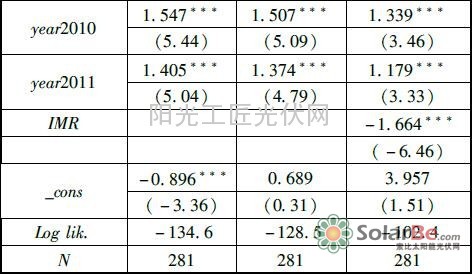 另外,从表3中可以看出:在光伏行业,企业的最终控制人类型、企业的规模以及高管持股的比例对企业进行研发可能性大小的影响并不显著,而企业的杠杆对企业研发的可能性产生了负面的影响,即企业的负债占企业资产的比率越高,企业越倾向于不进行研发活动。这可能是由于企业的负债越多,越难从外部融资来支持企业的研发活动,所以企业进行研发的可能性也越低。