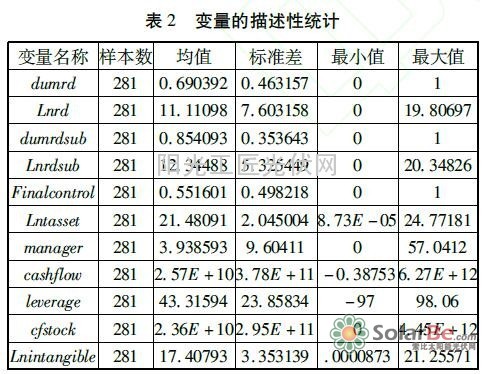 在上述的两个模型当中,dumrd为企业研发投入的虚拟变量,如果企业在当年进行了研发投资则取值为1,否则取值为0;dumrdsub为企业是否收到政府研发补贴的虚拟变量,如果企业在当年收到了来自政府的研发补贴则取值为1,否则取值为0;fina1contro1表示企业的最终控制人类型,如果企业的最终控制人类型为国有企业则取值为1,否则取值为0;