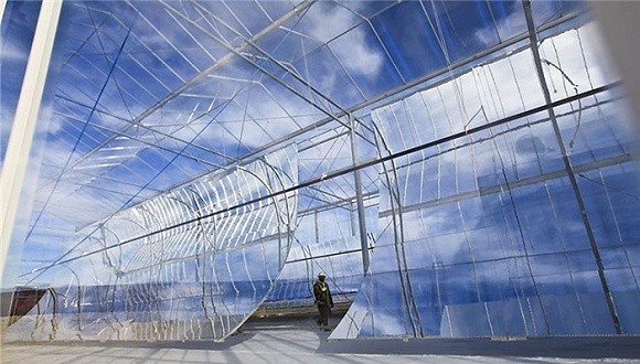 每个抛物柱面镜高达12米,太阳能被集聚到一根带有“热导溶液”(heat transfer solution,HTF)的钢管上,在热导溶液被卷入热力发动机前,它会沿着水槽延伸,并被加热至393摄氏度。在热力发电机中,热导溶液将同水混合在一起,从而产生出蒸汽带动发电涡轮机滚转。