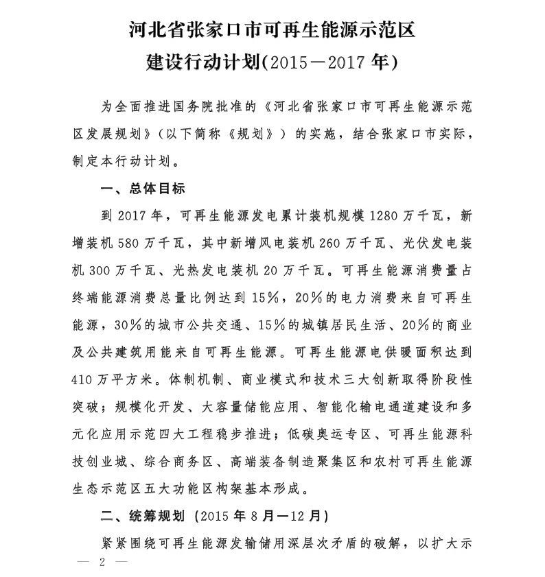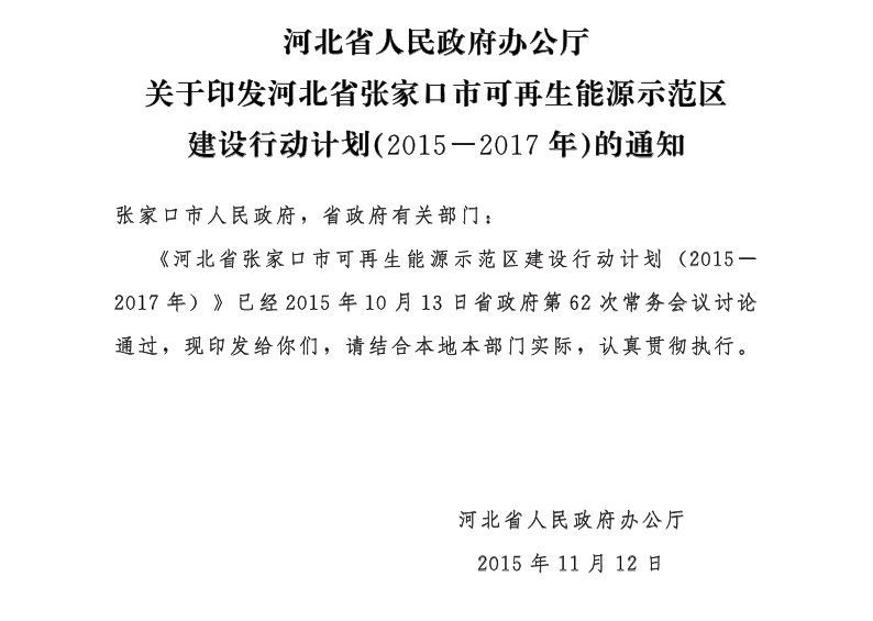 原标题:河北省人民政府办公厅关于印发河北省张家口市可再生能源示范区建设行动计划(2015-2017年)的通知