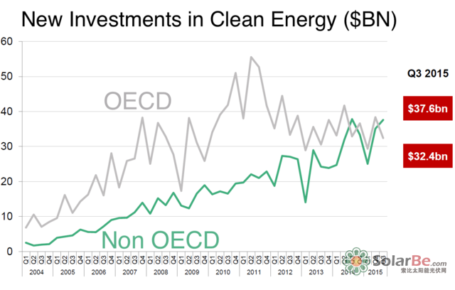 根据彭博新能源财经(Bloomberg New Energy Finance)发布的新分析报告,全球超半数的清洁能源年度投资,正来自新兴市场,而非富裕国家,为有史以来首次。这件事情就发生在去年,而且只是个开始。下面的图表,表明了经合组织成员国和非经合组织成员国之间清洁能源季度投资力度的不同。有种轨迹清晰可见:如果你是一家电厂的销售人员,从可预见未来的角度来分析,你可能会选择在贫穷国家的可再生能源行业工作。