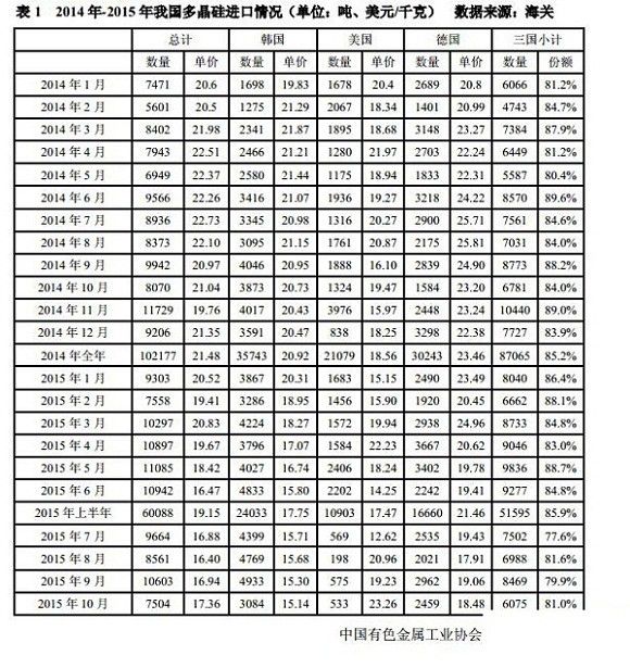 2015年1-10月份累计从美国进口多晶硅量为12734吨,同比减少21.7%;1-10月份进口均价为17.56美元/千克,同比降幅为8.6%。