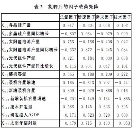 从表2可见,第一公共因子在X1、X3、X5、X7、X9等5个指标上有较大载荷,且指标体系包含了产业链的上中下游,可将其命名为“总量因子”;第二公共因子在X2、X4、X6、X13等4个指标上有较大载荷,代表各国光伏产品的产量增速状况,主要反映了光伏产业增长状况,可将其命名为“增速因子”;第三公共因子在X8、X10等2个指标上有较大的载荷,为装机容量增速和新增装机容量增速,主要反映了光伏产业市场需求变化,可将其命名为需求因子;第四公共因子在X11、X12等数个指标上有较大载荷,主要反映光伏产业创新环境以及技术支撑力,可将其命名为“技术因子”。可以看出,因子命名与之前构建的光伏产业链评价指标体系中的二级指标名称基本吻合,这既可以证明指标体系的科学合理性,也可以说明运用因子分析的可信性。