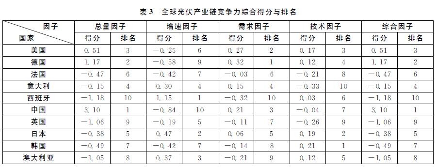 从表3的综合因子看,排在前4的国家的因子分析综合得分均大于0,分别是中国、德国、美国、日本,而其余国家的综合因子得分均小于0,这说明排在前4位的国家的产业链竞争力强,在光伏产业生产环节中处于领先地位,且从数据显示结果来看,处于综合排名第一的中国得分0.864,相比排名第二的德国得分0.326高接近三倍,这说明中国在光伏产业链中处于优势地位,中国太阳能资源丰富,劳动力资源丰富,又有优先的国家政策支持,生产率高,与其他各国相比在生产上占优势。从总体来看,各国皆处于产业链不同阶段,发展程度不同,发展差距较大。