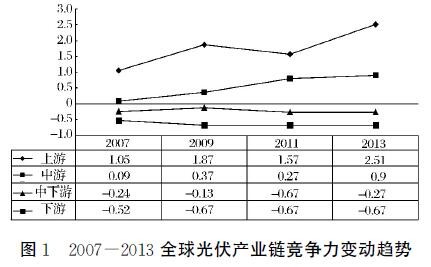 从图1可以看出。2007年-2013年,全球光伏产业链发展呈现出三种变化趋势:①上游产业链呈现波动上升状态。②中游产业链呈现直线上升状态。③中下游和下游产业链呈现平稳上升状态。上游产业链技术要求性强,资金投入大,对企业要求高,企业进入门槛高,竞争力最强;中游产业链主要生产太阳能电池和光伏组件,多为劳动密集型产业,对企业技术要求不高,竞争力相对较弱;下游产业链主要进行光伏系统安装及应用,产量较大,但应用水平不高,竞争力弱。总之,光伏产业链的竞争力及其分布与国家政策,经济、科技发展水平及其外部环境有关,要想获得较好发展,需要良好的外部环境和强大的企业实力。
