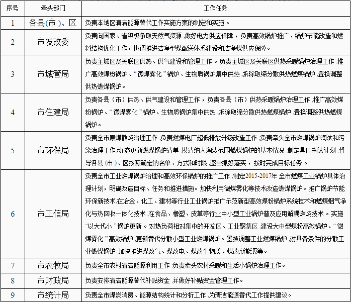 (二)抓好方案制定。各县市区政府、管委会,市政府有关部门根据本方案和各自职责抓紧制定具体实施方案,将目标任务层层分解,落实到相关行业和企业,细化阶段性目标,确定实施步骤和措施,统筹推进落实,确保完成清洁能源替代目标任务。
