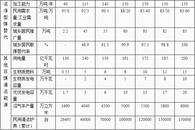 3、煤炭清洁利用:建设洁净型煤配送体系,到2017年,全市洁净型煤年生产加工能力达到150万吨,推广80万吨,替代原煤104万吨,推广率达到90%以上,到2020年推广率达到100%。