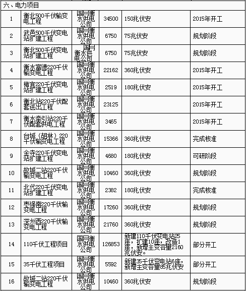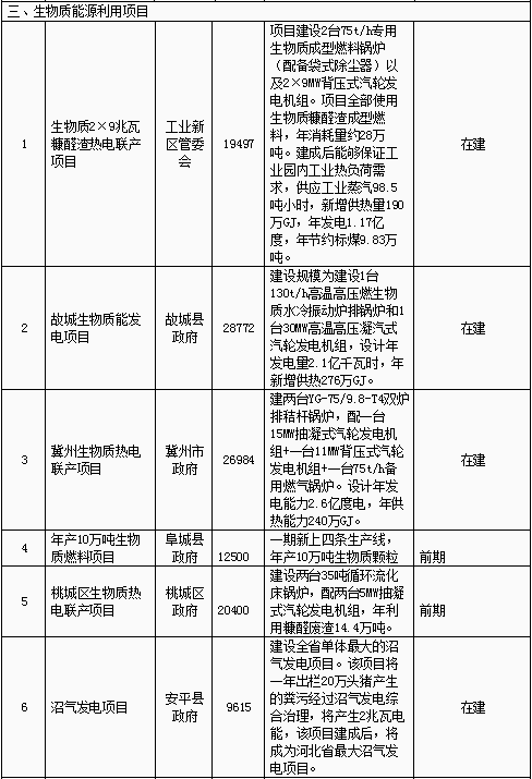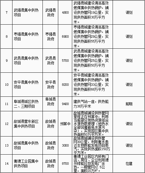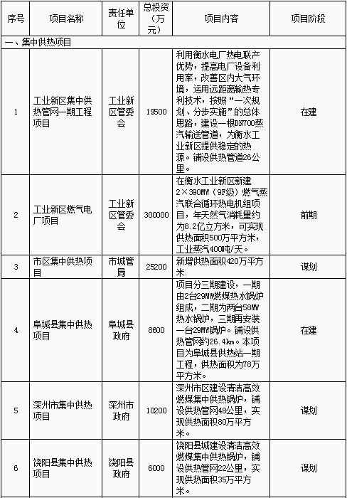 衡水市2015年至2020年谋划实施集中供热项目14个,总投资41亿元,全部建成后可新增供热面积1574万平方米;实施天然气项目17个,总投资33亿元,项目建成后可进一步提高供气能力和气化率;实施生物质能源利用项目9个,总投资13亿元,全部建成后可新增104兆瓦装机容量;实施洁净型煤项目13个,总投资1.5亿元,全部建成后可形成年产150万吨洁净型煤能力;实施光伏发电项目8个,总投资23亿元,全部建成后可新增光伏发电装机容量250兆瓦;实施电力项目16个,总投资31亿元,项目建成后进一步提高供电保障能力;实施重点用能企业节能技改,总投资27亿元,完成后实现节能量16.7万吨标准煤。