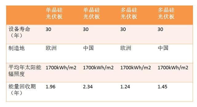 举例来说,下表格是两张(分别采用单晶硅和多晶硅技术)在欧洲和中国制造的太阳能板的能量回收时间,其安装地点为欧洲,峰值功率为3KW。位置非常关键,因为回收时间取决于安装区域单位电能的含能量。在欧洲,每度电的平均含能量,是11.4MJ的基础能源。设施相同条件下,电能含能量较低的国家,可再生能源的回收期就越长。
