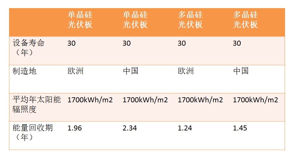 举例来说,下表格是两张(分别采用单晶硅和多晶硅技术)在欧洲和中国制造的太阳能板的能量回收时间,其安装地点为欧洲,峰值功率为3KW。位置非常关键,因为回收时间取决于安装区域单位电能的含能量。在欧洲,每度电的平均含能量,是11.4 MJ 的基础能源。设施相同条件下,电能含能量较低的国家,可再生能源的回收期就越长。