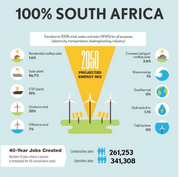 上面这张图表展现了非洲要实现100%可再生能源供能,各种能源供能方式的比例分配,其中,光热发电将占10%的供能比例,规模化光伏发电站的供电比例为56.7%。