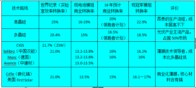 近年来CIGS薄膜电池技术的确取得了长足进步,汉能在德国的Solibro公司2014年4月份就宣布,CIGS(铜铟镓硒)薄膜太阳电池取得重大突破,其转化率达到20.5%,并通过了美国可再生能源实验室(NationalRenewableEnergyLaboratory)测试及认证。德国Manz集团更是将CIGS薄膜太阳电池的实验室转换效率刷新至21.7%,并且效率提升空间有望在近年突破25%。我国中科院深圳先进技术研究院采用共蒸法研制出超过20%转化率的CIGS薄膜电池,也在向产业化推进。