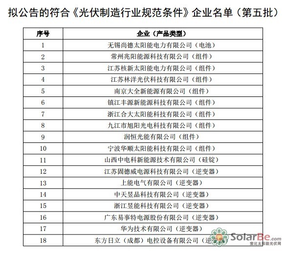 根据《光伏制造行业规范条件》(2015年本)及《光伏制造行业规范公告管理暂行办法》,经企业申报、省级行业主管部门核实推荐、我部组织专家进行书面复核,现将拟公告的符合《光伏制造行业规范条件》企业名单(第五批)予以公示。