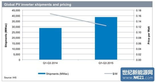 最新IHS研究报告指出今年的前9个月,全球光伏(PV)逆变器发货量同比增长了35%。然而,价格下跌了26%——0.12美元每瓦特。虽然全球光伏逆变器的价格下降,但仍有20GW的逆变器将会在2015年第四季度出货,这将导致收入同比增长4%达到69亿美元。中国、美国和其他主要成长型市场的竞争激烈,加上日本和德国的市场停滞不前——都加剧了价格战争的爆发。据IHS公司预测。大型电站是导致价格下降的关键。IHS分析师预测,在未来的15个月里,美国低价位的集中式逆变器份额比重将越来越大。