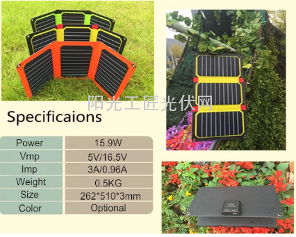 跟传统的太阳能充电包比,该产品采用的是一种新型的一体成型的层压技术,比布缝折叠的充电包更轻更薄,功率高达11瓦,折叠后的尺寸只有263*175比同款布缝10瓦的产品面积少了很多。