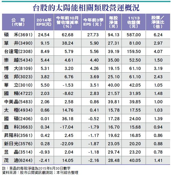 至于茂迪、升阳科、昱晶及太极等电池厂,今年第三季的获利也都明显好转,其中由上市公司广运机械转投资的太极,第三季单季的EPS(每股税后纯益)达0.41元,表现更是优于同业。至于生产太阳能导电浆的硕禾,第三季单季的EPS高达15.25元,使得前三季EPS达27.73元,已经超过去年全年的24.54元,获利能力傲视其他太阳能族群。