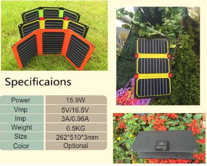 该产品采用的是一种高效单晶硅Sunpower电池片,转换效率高达24%,表面采用的封装材料是国家水立方的封装材料:ETFE。这种材料优势就是寿命更高,透光率更好,三折的产品冲ipad最快1.5小时不仅可以充手机,还可以冲12V电压的产品,还有笔记本的蓄电池。