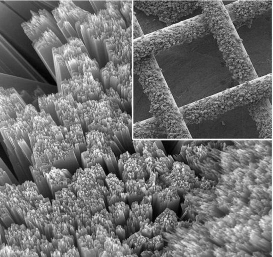 藉由光和空气便可自行充电的太阳能电池:负责捕捉光能的二氧化钛柱和覆盖于上方的网状态金属,可允许空气从孔隙中流入电池。