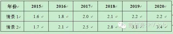 下表是基于“情景1:缴纳补贴的用电量相对于2014年逐年增加7.2%”和“缴纳补贴的用电量保持2014年的数值不变”两种情形估算每度电的附加值。