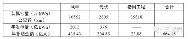 综上所述,截止2014年底,风电、光伏项目及其接网工程预期的年补贴金额如下表。