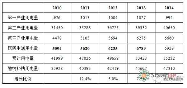 根据中电联的统计,2010~2014年,整个社会的用电量情况如下表所示。