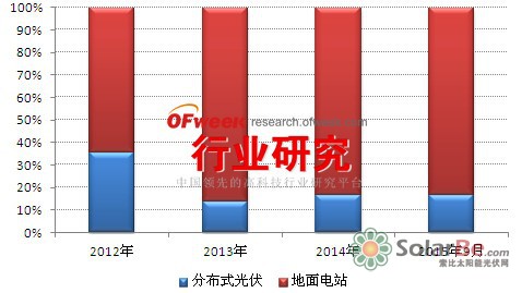 OFweek行业研究中心认为,随着国家对分布式光伏电站发展的支持力度不断加大,未来国内分布式光伏的潜力要大于地面光伏电站,但分布式光伏短期爆发超越地面光伏电站的可能性不大,短期内,国内光伏装机主要还是集中在地面光伏电站。截至2014年底,我国分布式光伏发电累计装机容量达4.67GW,预计到2015年底我国分布式光伏发电累计装机容量将超过7GW,达到7.47GW。