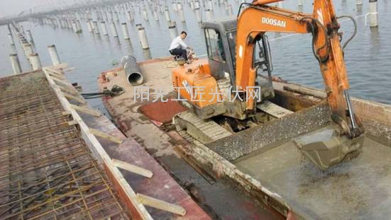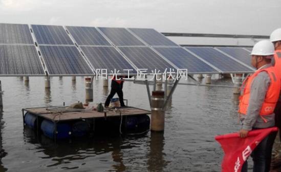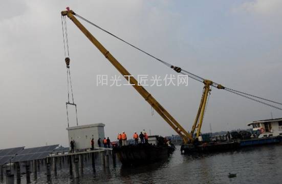 看来这是要进入到关键阶段了,工人们开始在支架上安装太阳能电池板,这项工作看起来也同样不简单,因为他们只能穿着救生衣,在浮桥上安装,而且还必须得保证安装得整整齐齐,还真替他们捏把汗!