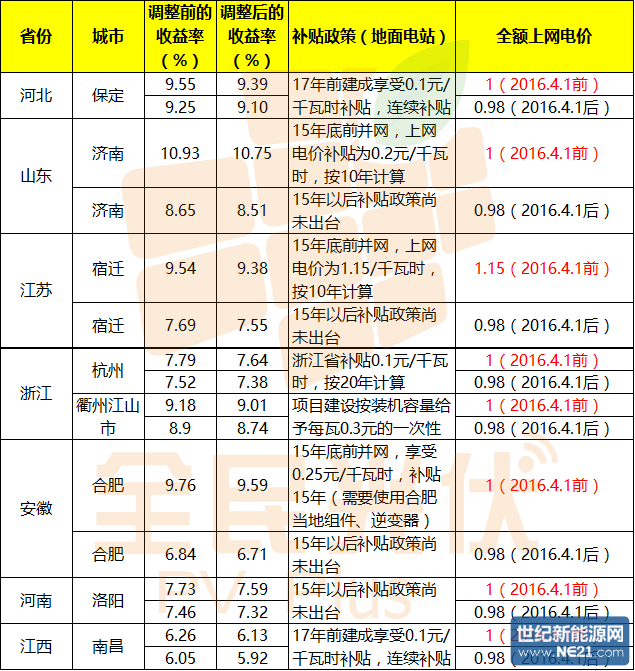 表中所用全额上网电价(2016.4.1前)依据国家发改委2013年发布的《关于发挥价格杠杆作用促进光伏产业健康发展的通知》,2016.4.1后的全额上网电价依据国家发改委今年十月下发的《关于完善陆上风电、光伏发电标杆上网电价的通知》。