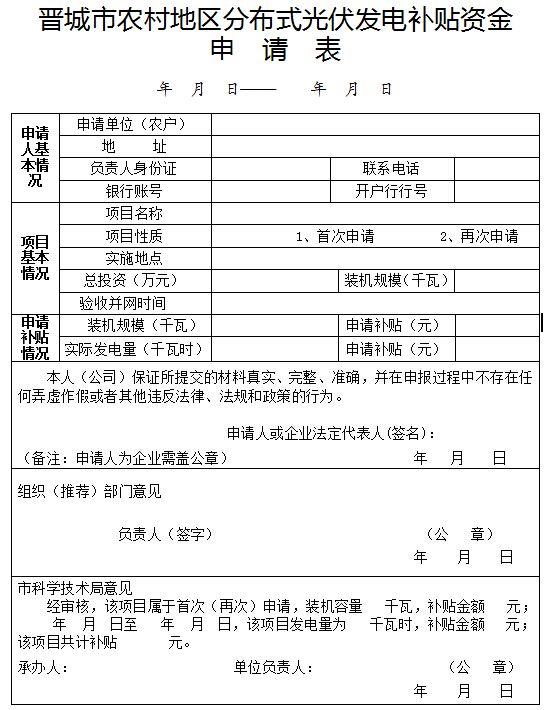 (一)晋城市农村地区分布式光伏发电补贴资金申请表(见附件)。