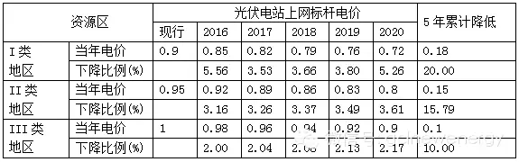 下表为根据“讨论稿”附件——“光伏发电电价逐年调整方案”,对不同资源区上网电价变化进行的分析: