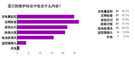 对“签订的维护协议中包括什么内容”的提问,回答“定期检查”的最多,为93.1%。其次是“发电量监控”,为86.2%,“紧急应对”和“除草对策”等为70%以上。“电池板清洗”为55.2%。