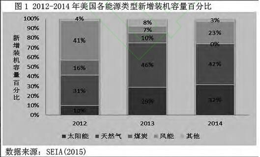 美国是世界上较早发展分布式光伏发电的国家之一。2006年美国有6000多座分布式发电站,200多个大学校园采用了分布式发电站供电。目前,分布式光伏在美国能源利用中扮演着越来越重要的角色。截至2014年末,美国光伏发电装机总量达20GW,其中分布式光伏超过16.lOGW。新增光伏发电装机仅次于天然气(图1),住宅光伏装机首次超过非住宅光伏(SEIA,2015)。