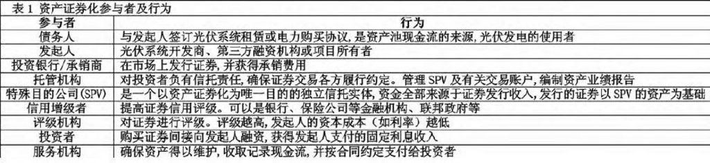 2012年,美国国家可再生能源实验室(NREL)创立太阳能进人公共资本(Solar Accessto Public Capital,SAPC)工作组,旨在推动光伏发电资产的证券化,联合开发商、法律机构、金融机构、评级机构以及咨询服务机构等共同促进美国资本市场光伏项目的投资,相关机构具体职责见表1。为增加消费透明度,降低太阳能资产的交易成本,促进项目证券化,SAPC的主要工作内容是对协议进行标准化,包括电力购买协议(PPA)、租赁协议、住宅和商业开发相关文件;建立数据库用于评估业绩和违约风险;进行模拟评级来增强投资者对投资风险的认知。SAPC也会提供平台用于讨论与交流,如建立光伏证券市场的门槛、机遇、风险等。