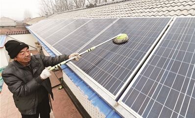 图为12月9日,永清县别古庄镇后刘武营村村民在擦拭安装在屋顶的光伏发电太阳能面板。