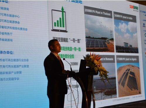 在论坛上,阳光电源市场总监张彦虎博士发表了《借“一带一路”东风加速逆变器走出国门》的演讲。张博士表示:得益于国家“一带一路”战略,全球发展中国家可再生能源的需求及中国高品质的光伏产品,中国光伏在“一带一路”沿线国家市场取得重大突破。作为中国第一大逆变器专业制造商,阳光电源海外市场更是捷报频传,在亚洲、非洲、欧洲等光伏市场上屡获大单,比如阿尔及利亚中技贾内特的170MW光伏项目,中巴经济走廊上的巴基斯坦900MW光伏项目等。