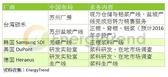 全球四大浆料厂──韩国三星SDI、美国杜邦、德国贺利氏、中国台湾硕禾近年接连在大陆成立生产基地或研发单位,以求就近与全球最大的太阳能电池生产基地接触,获取更高利润。然而,大陆市场虽然庞大,却也有不小的隐忧。