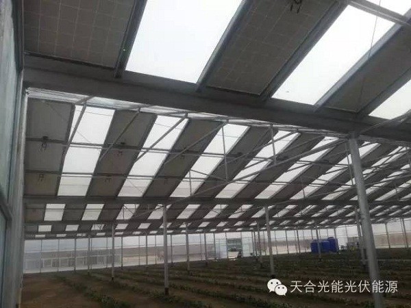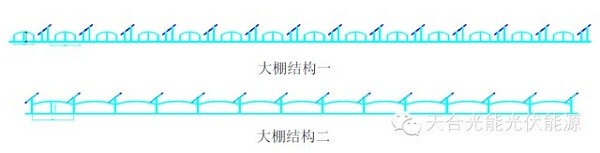 光伏和农业大棚的附加式结合模式,在常规光伏电站中,光伏阵列之间建设光伏大棚,两者的独立的,在空间布局上有相互结合,互不影响。模式2中的结合方式即是在模式1中建设了薄膜大棚。这种大棚模式类似于光伏建筑中的BAPV。