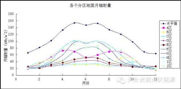当分析光伏阵列中的光资源时间和空间两个维度的数据时,数据量是较多和复杂的。为了直观的展示数据的差异,选取“表6各个分区的1m高度月辐射量”作图如下: