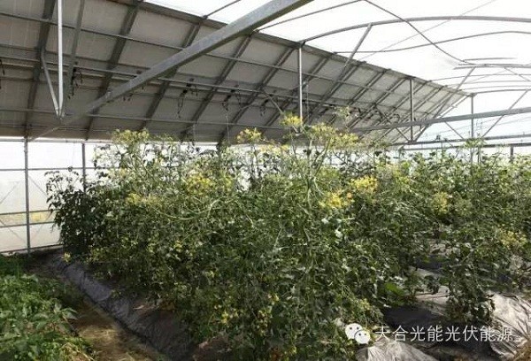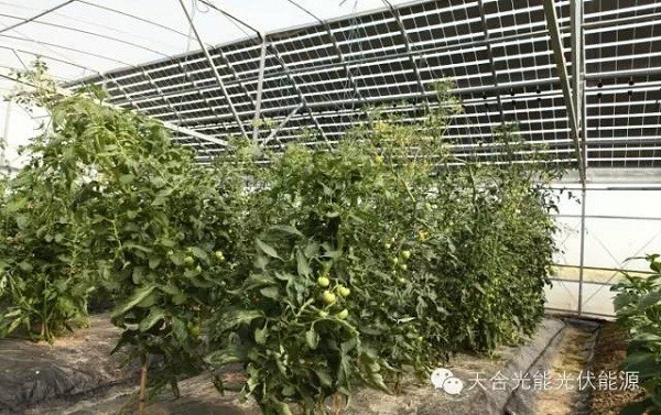 通过两张照片对比,图13(a)中,由于普通多晶硅组件遮光,西红柿对光照的需求得不到满足,西红柿茎杆较多较细,花朵较多,但是花朵常不挂果,结的果实小、少,难以生长;图13(b)中,双玻组件下的西红柿茎杆粗,果实多、大。同样对比的黄瓜,普通多晶硅组件下方的黄瓜果实少而细,双玻组件下的黄瓜多而粗。由于双玻组件有20%的透光率,大棚内光照较多,与普通组件下方的农业生产产量形成明显对比。